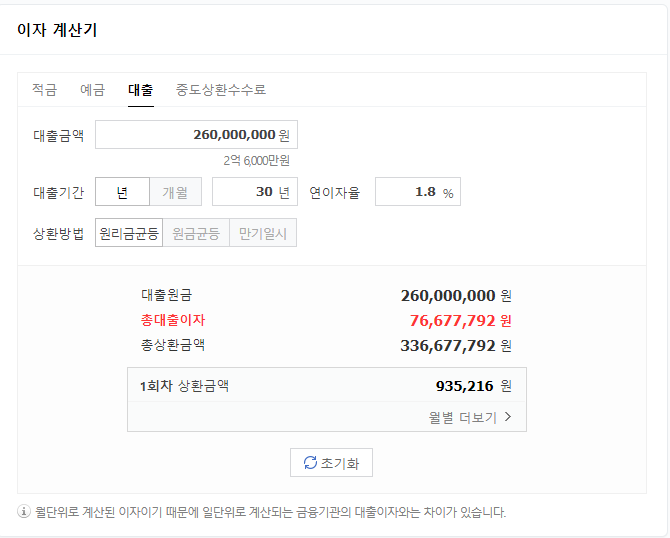 추신으로 아래는 최대 2.6억을 대출해본 계산(동일하게 1.8% 기준)