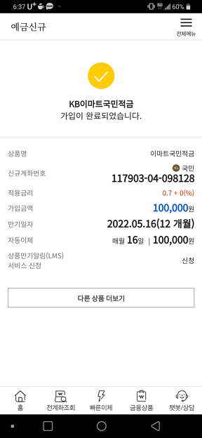 물론, 적금 가입 금액은 월 10만원 1년짜리로 약하긴 하지만,
